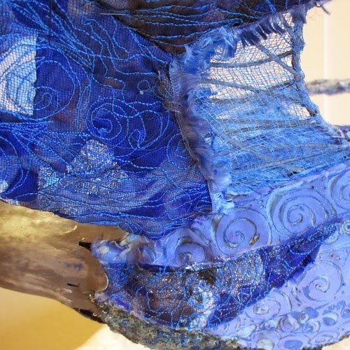 I love the colours of the traditional Willow Pattern… these blues induce a sense of calm and peace and the sight of a blue bird is often seen as a symbol of happiness and contentment…. One of the works in the current "Layered" exhibition by the Newcastle Creative Embroiderers and Textile Artists is Blue Bird which was completed in December. I covered a wire frame with different fabrics, which have been felted, stitched by hand and/or machine, painted and stamped, dyed. This textile art is a derivative of an earlier collaborative work created for International Women’s Day 2013.